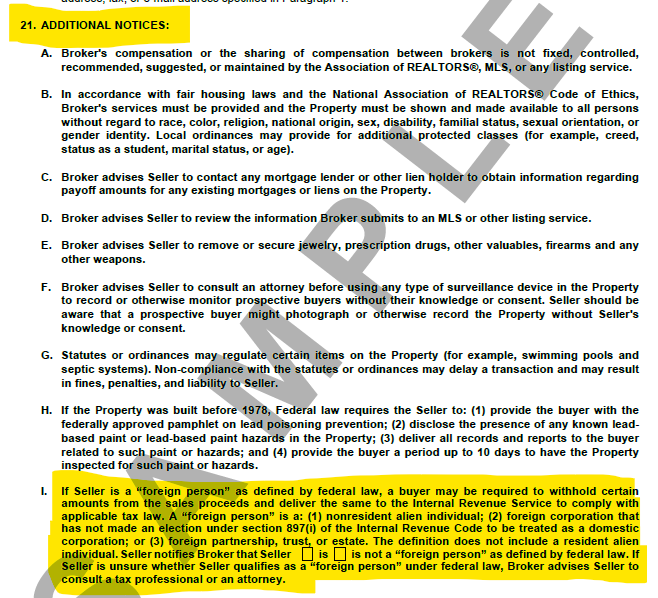 In TX, the listing agreement talks about FIRPTA (or "if the seller is foreign") in paragraph 21 - sub paragraph I